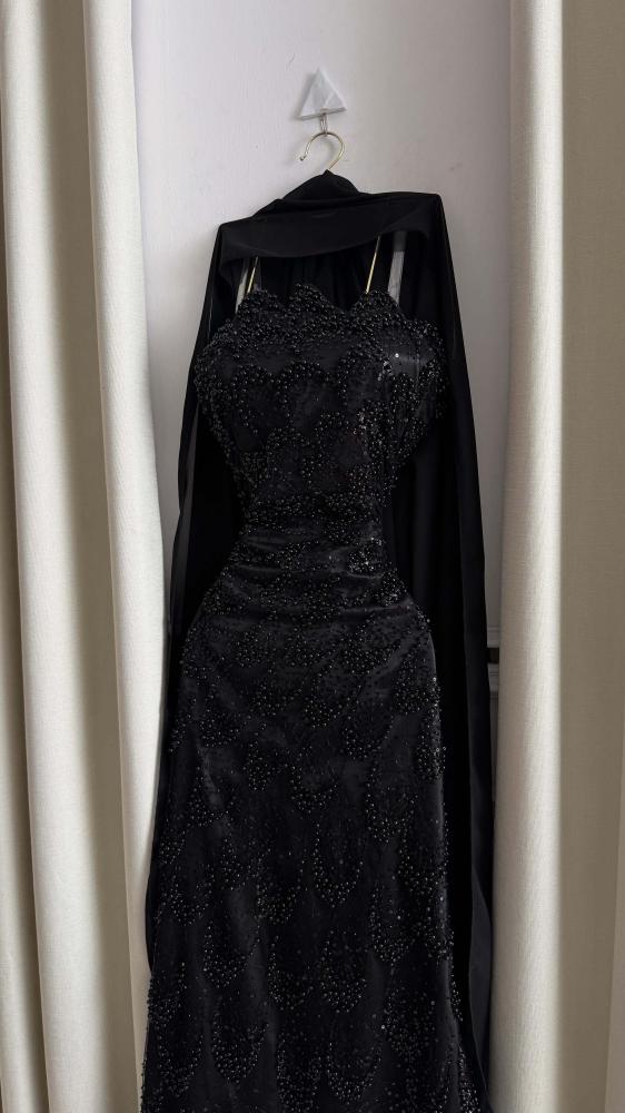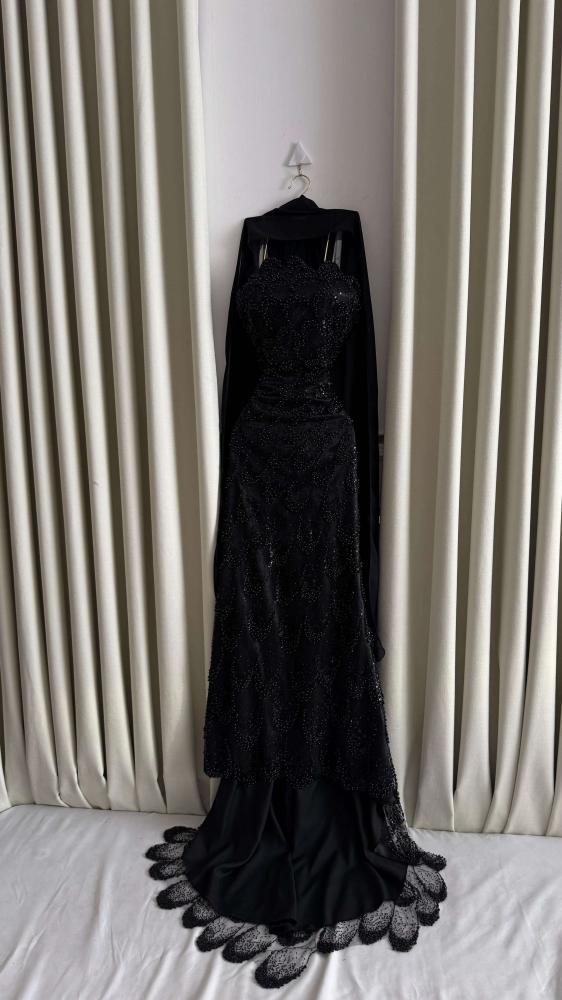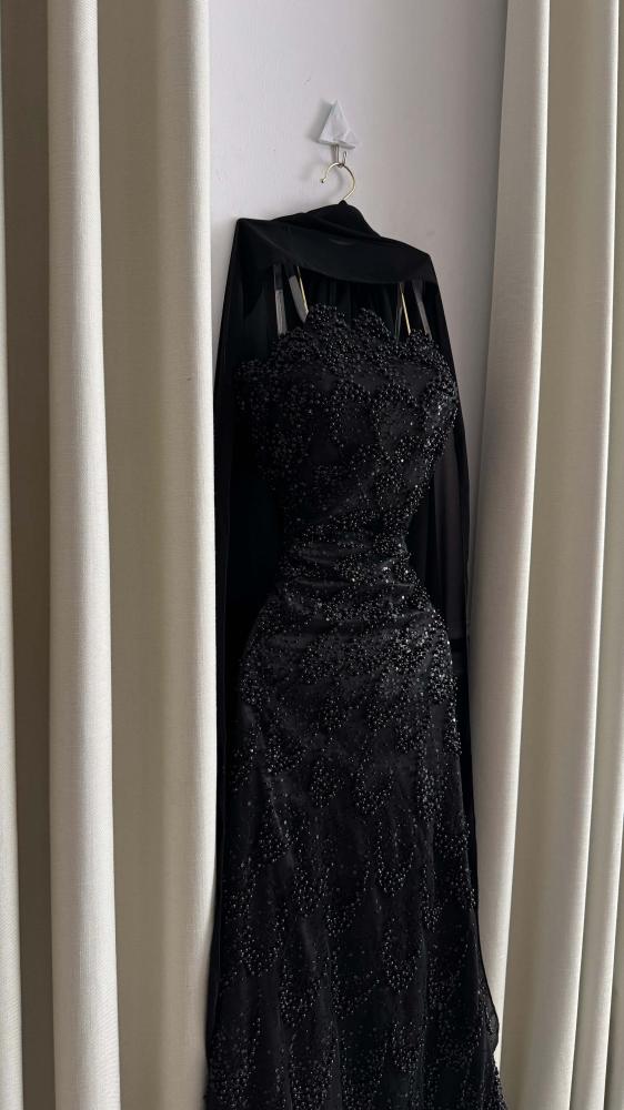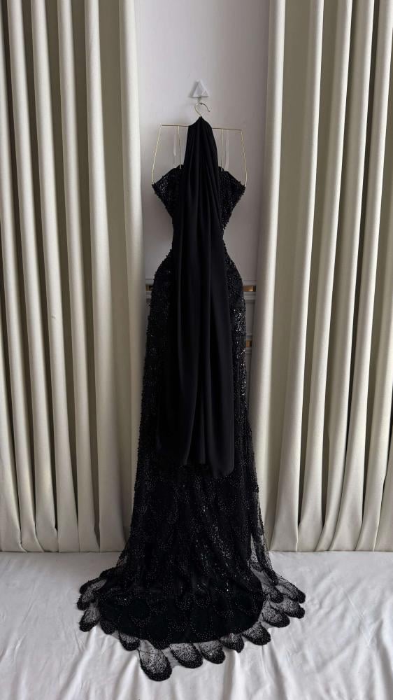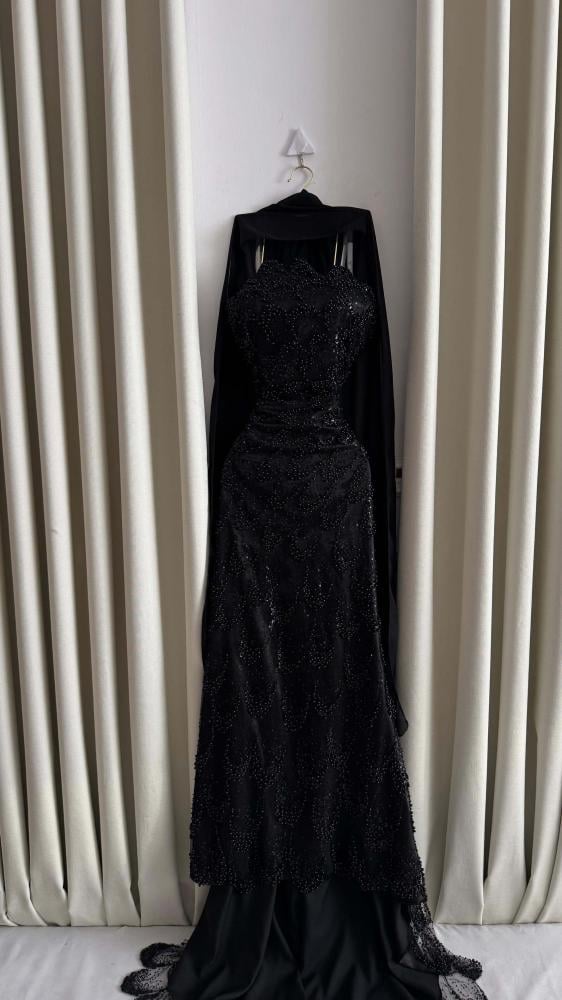فستان سهرة طويل بقصة حورية البحر، يتميز بتطريز فاخر من الترتر والخرز بنمط المروحة الجذاب على كامل القماش، مع ياقة بتصميم قلب الصدر (Strapless Sweetheart) تبرز الأنوثة. مثالي للسهرات الكبرى والمناسبات الراقية لإطلالة خاطفة للأنظار.