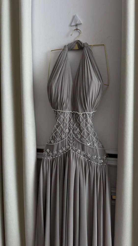 فستان سهرة طويل بلون البيج الرمادي الراقي (Taupe)، مصنوع من قماش الشيفون الانسيابي. يتميز بقصة "هالتر" (Halter Neck) مع طيات فاخرة وكشكشة فنية على الصدر. يزداد سحراً بالتطريز اليدوي الدقيق الذي يحيط بمنطقة الخصر والبطن بنقوش ماسية متألقة. ينسدل الفستان بقصة واسعة وناعمة تمنحك حضوراً رقيقاً ومميزاً في جميع المناسبات الراقية.