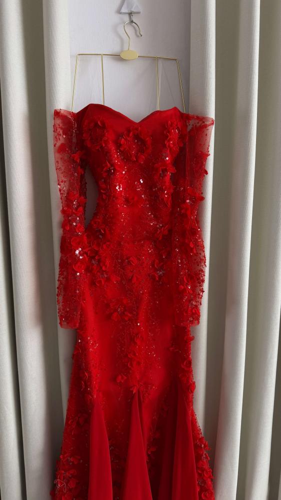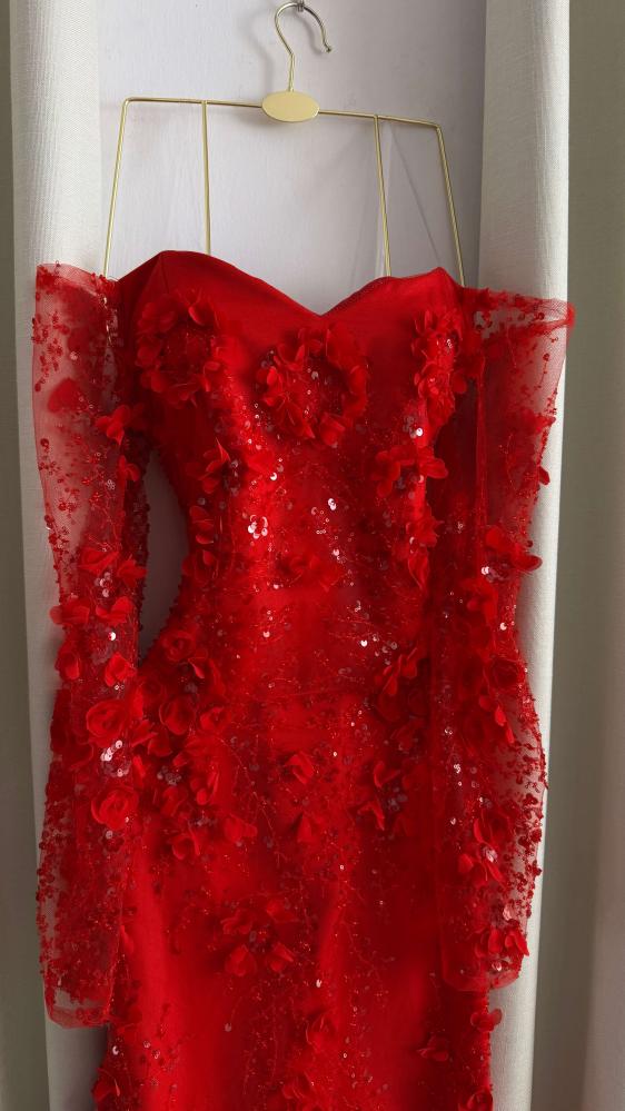 Immerse your senses in the beauty of the Enchanting Red Blossom Gown, an artistic masterpiece designed to captivate. The dress is adorned with intricate 3D floral embroideries elegantly scattered over sheer tulle fabric, with a captivating mermaid silhouette that alluringly accentuates your curves. Long sleeves embellished with flowers add a touch of sophistication and mystery. Perfect for your most distinguished evenings and wedding celebrations, it combines bold elegance with romantic allure.